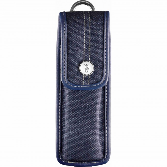 В обоих случаях, чехлы выполнены из голубой ткани снаружи, и кожи изнутри (дабы защитить клинок от влаги). Закрыть чехол можно с помощью небольшой металлической кнопки, на которой нарисован фирменный логотип Опинель – коронованная рука.